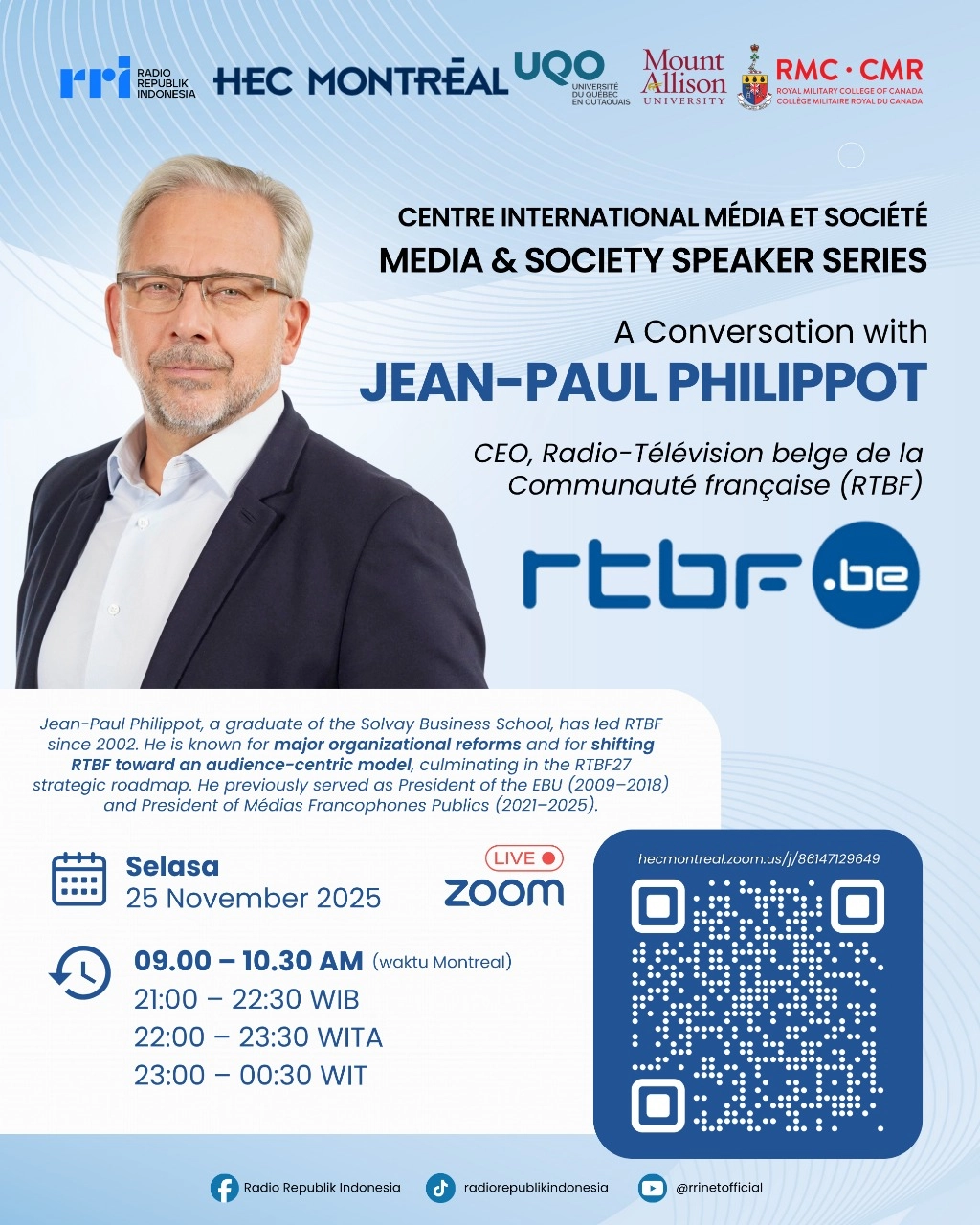 A graduate of the Solvay Business School (Université libre de Bruxelles), Jean Paul Philippot is CEO of RTBF (Radio-Télévision belge de la Communauté française).